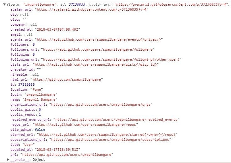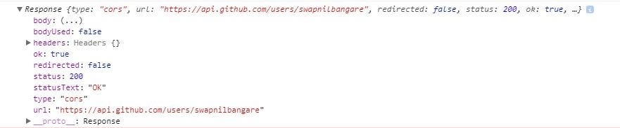 The above code makes use of Fetch API and makes a call to GitHub to fetch data about the user. When the promise is resolved we get a Response object in return. But wait, if you try logging Response object on the console you will find that it didn’t have the data which we want. That’s because a Response object has information about the response itself. To actually get the data, we need to get the body of the response.