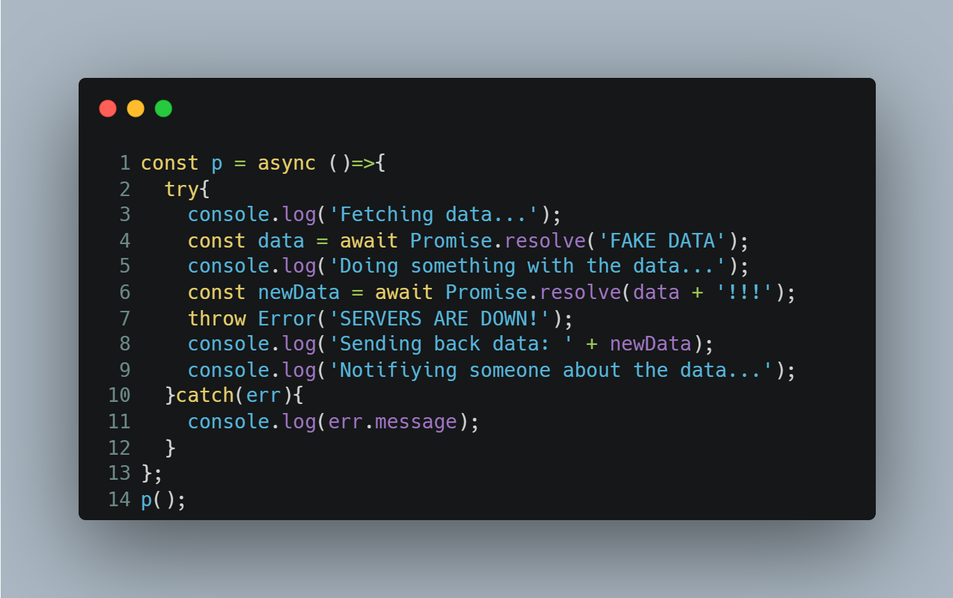 Because remember, an async function implicitly returns a promise for you. Therefore, we can make use of the catch() method to catch any errors within the function as illustrated in the above example.